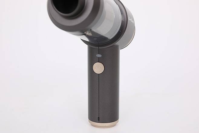 손잡이 앞부분에는 샴페인 골드 컬러의 원형 전원 버튼이 위치해 있으며, 버튼 바로 위에 전원 상태 표시등이 있다. 버튼 아래쪽 끝부분에도 LED 인디케이터가 하나 있는데, 충전 상태 표시등이다.