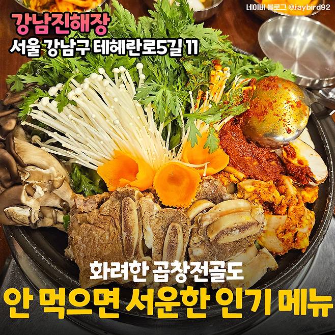 강남진해장은 여러 방송에 출연한 건 물론이고 2020년부터 4년 연속으로 블루리본 서베이 맛집, 망고플레이트 인기맛집으로 선정되기도 한 인증받은 곳이랍니다. 곱창전골도 인기 메뉴라고 하니 가족분들과 방문해서 맛있는 식사 한끼 하시면 좋을 것 같아요.
