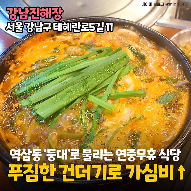 첫 번째는 성시경 추천 맛집으로도 유명한 <강남진해장>이에요! 일요일 저녁 10시 마감, 월요일 아침 6시 오픈인 것만 제외하고는 매일같이 24시간 영업한다고! 지나갈 때마다 불이 켜져있어서 동네 주민들은 '역삼동 등대'라고 부르기도 하나봐요.