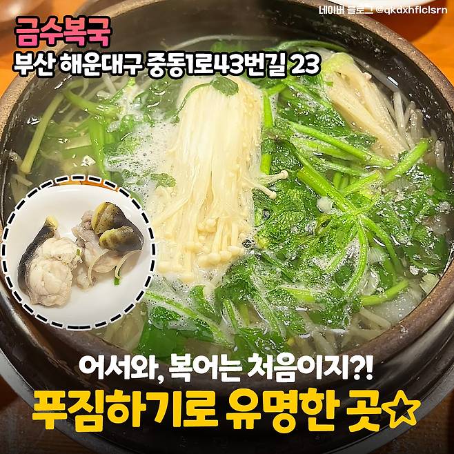 세 번째는 부산 해운대에 위치한 <금수복국>이에요! 금수복국은 '어서와! 한국은 처음이지?'라는 프로그램에서 영국 친구들의 해방여행 편에도 등장했던 맛집이에요.