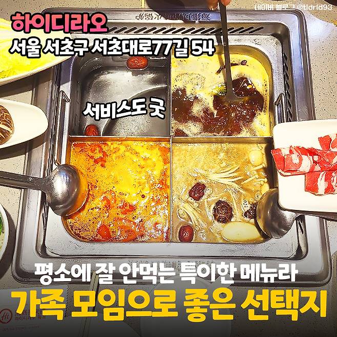 두 번째로 밥심이네 단골 가족모임 장소인 <하이디라오>를 소개해 드릴께요. 서초, 명동, 홍대 등 수도권에만 지점이 6곳 있고 부산역 근처에도 1곳 있는 프랜차이즈랍니다. 마감시간도 서초, 명동, 영등포, 부산역 지점은 새벽 3시! 홍대, 대학로, 건대지점은 새벽 5시로 상당히 여유로운 편이에요.