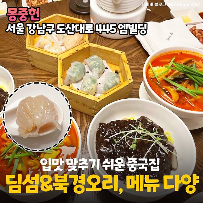 네 번째로 입이 많아도 무난하게 다녀올 수 있는 중국집 <몽중헌>을 소개해 드릴게요. 프랜차이즈 중에서도 본점인 청담점은 맛이 다르다고 할 정도로 JMT라고 해요! 게다가 룸좌석이 대부분이라 가족모임에 안성맞춤!