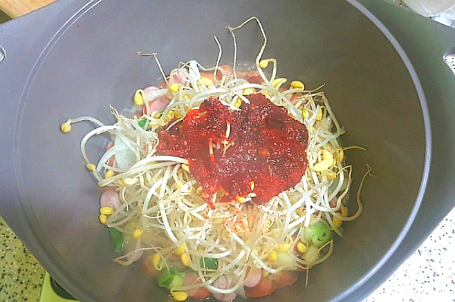 물이 끓으면 대파, 양파, 콩나물을 넣고요. 참기름을 제외한 양념을 다 넣고 섞어줍니다