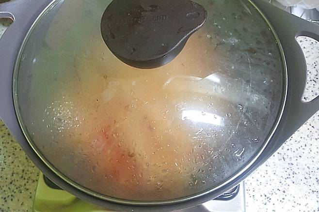 뚜껑을 닫고 팔팔 끓여 주세요. 처음에는 물이 너무 적나 싶지만 야채에서 수분이 나오더라고요.