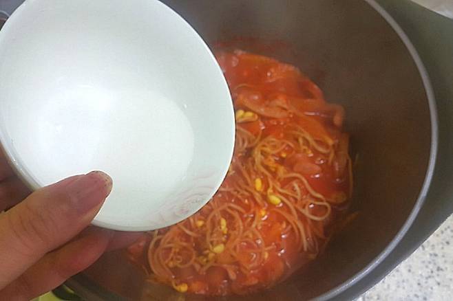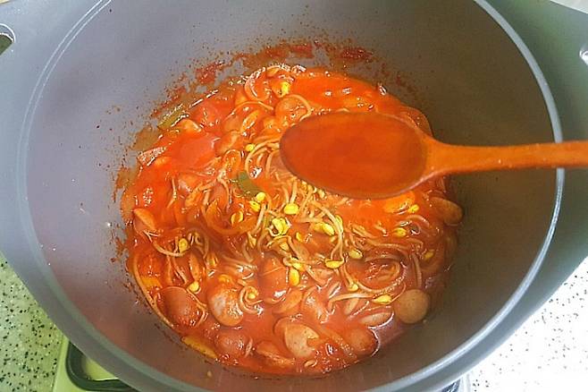 콩나물 숨이 죽고 국물이 자작해지면 전분 1T에 물 2T를 섞어 전분물을 만들어 조금씩 부어줍니다. 전분물을 넣으면 국물이 금방 걸쭉하게 돼요. 한 번에 다 붓지 말고 조금씩 부어가며 농도를 맞춰 주세요.