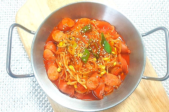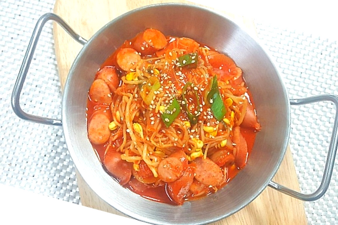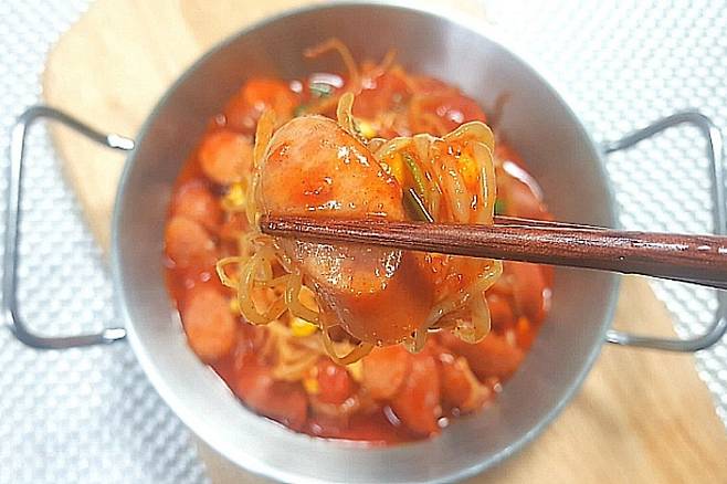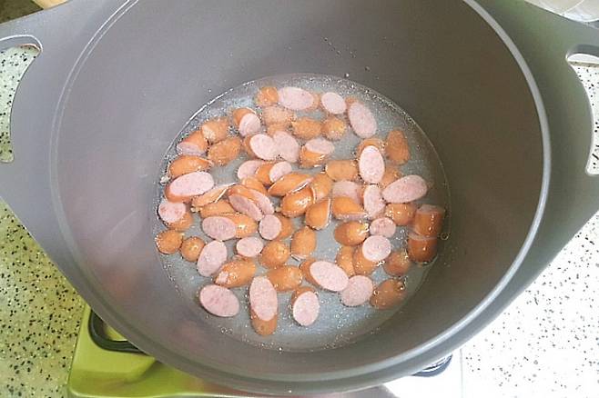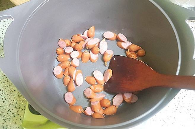 소시지를 볶다가 절반 정도 익으면 종이컵 기준 물 1컵을 붓고 끓여 주세요