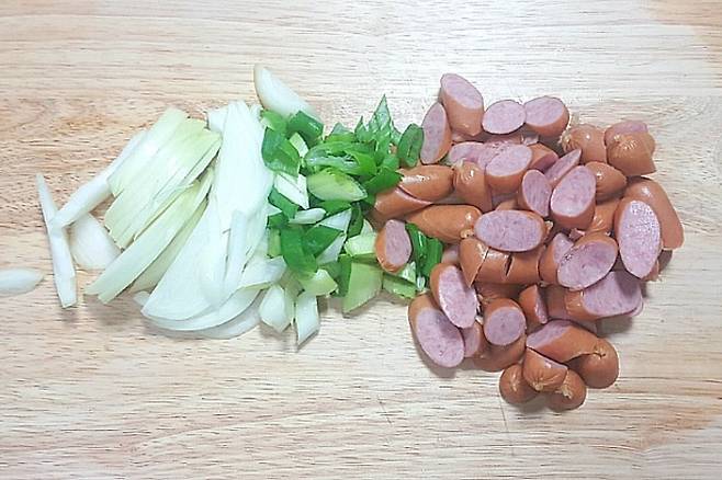 양파는 얇게 채 썰어 주시고요. 대파와 비엔소시지는 어슷 썰기를 해 줍니다. 비엔나소시지를 더 건강하게 드시려면 뜨거운 물에 한번 데쳐주세요.