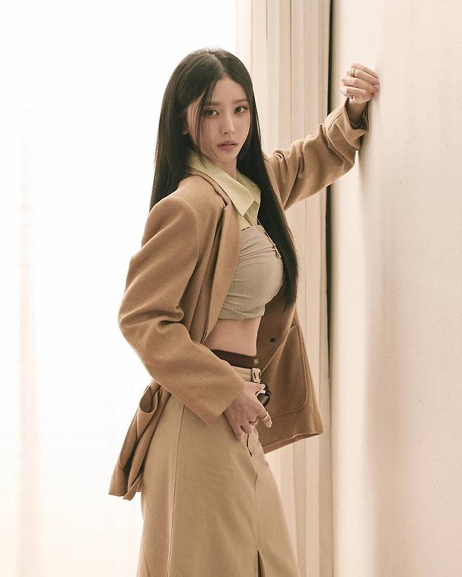 브라운 컬러를 메인으로 한 톤온톤 매치가 돋보인다. 오버핏의 카멜 컬러 재킷 안에 베이지 톤의 튜브톱을 매치하여 과감하면서도 세련된 룩을 완성했다. 상의는 크롭 기장으로 복부 라인을 살짝 드러내어 트렌디함을 강조했으며, 하의 역시 같은 계열의 색상으로 통일감을 주었다. 자연스럽게 늘어뜨린 긴 생머리와 함께 은은한 조명이 더해져 깊이 있는 분위기를 자아낸다. 전체적으로 차분한 색감이지만 소재와 기장의 차이를 통해 지루하지 않고 감각적인 스타일링을 보여준다.