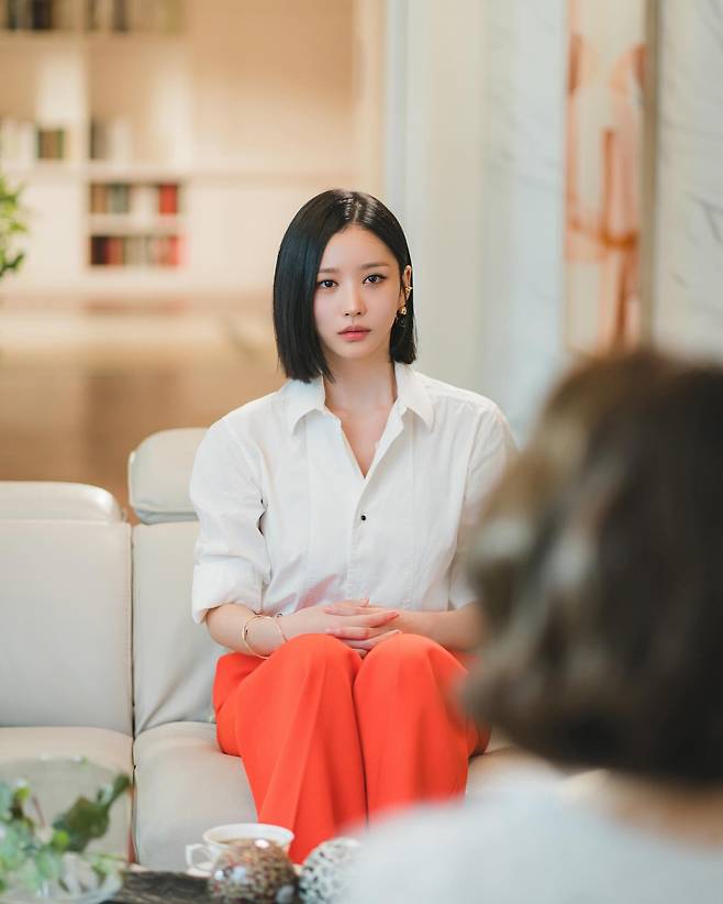단정한 화이트 셔츠에 강렬한 오렌지 컬러의 팬츠를 매치하여 시선을 사로잡는 오피스룩을 완성했다. 군더더기 없는 디자인의 화이트 셔츠는 단추를 살짝 풀어 여유로운 느낌을 주며, 하의의 쨍한 컬러감이 룩 전체에 생동감을 불어넣는다. 앉아 있는 자세에서도 느껴지는 비비드한 팬츠의 존재감은 자신감 넘치고 프로페셔널한 커리어 우먼의 이미지를 연상케 한다. 심플한 액세서리와 정갈한 헤어스타일이 더해져 지적이면서도 세련된 무드를 극대화했다.
