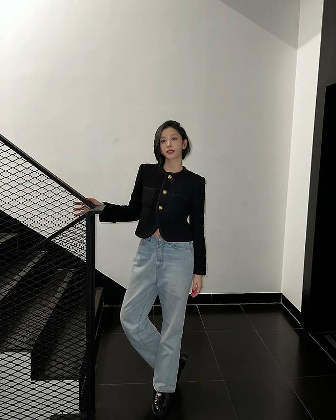 클래식한 블랙 트위드 재킷에 캐주얼한 데님 팬츠를 조합하여 세련된 믹스매치 룩을 선보였다. 재킷에 달린 볼드한 골드 버튼이 전체적인 룩에 고급스러운 포인트를 더해준다. 이너 없이 재킷을 단독으로 착용하여 목선과 쇄골 라인을 깔끔하게 드러냈으며, 짧은 기장의 상의가 다리를 더욱 길어 보이게 만든다. 여기에 와이드한 핏의 연청 데님을 매치해 너무 무겁지 않으면서도 편안한 멋스러움을 연출했다. 깔끔하게 정리된 단발머리는 도회적이고 시크한 이미지를 배가시킨다.