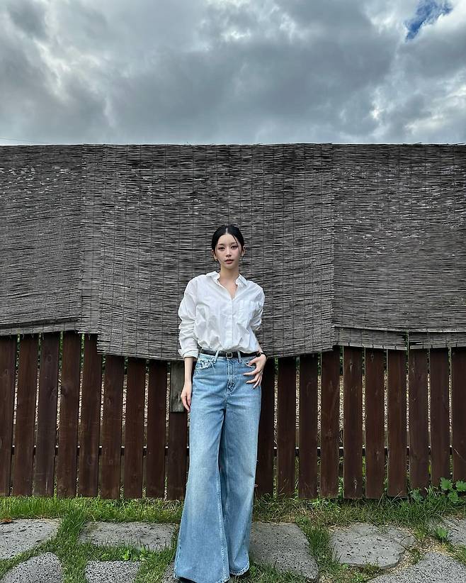 가장 기본적이면서도 스타일리시한 화이트 셔츠와 와이드 데님 팬츠의 조합이다. 넉넉한 핏의 화이트 셔츠 소매를 자연스럽게 걷어 올려 꾸미지 않은 듯한 내추럴한 멋을 살렸다. 셔츠를 팬츠 안으로 넣어 입고 블랙 벨트로 허리 라인을 강조함으로써 전체적인 실루엣을 정돈했다. 발등을 덮는 기장의 와이드 데님은 힙하면서도 편안한 느낌을 준다. 화려한 장식 없이 기본 아이템만으로도 청순하고 맑은 분위기를 완벽하게 소화해냈다.