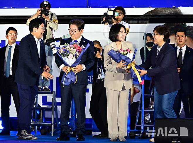 [서울=뉴시스] 조성우 기자 = 이재명 대통령과 김혜경 여사가 4일 오전 서울 여의도 국회 앞에서 열린 국민 개표방송 행사에서 박찬대 상임총괄선대위원장과 정은경 총괄선대위원장에게 꽃다발을 받고 있다. (공동취재) 2025.06.04. photo@newsis.com
