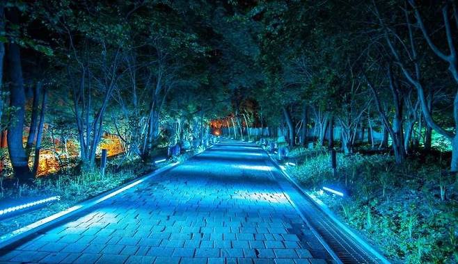 벚나무와 소나무가 어우러진 숲길 사이로 조형물들이 배치돼 있어, 인위적인 전시장과는 다른 개방감 있는 감상이 가능하다.