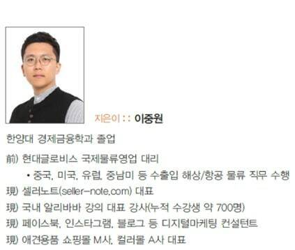 이중원: 그런데 그렇게 직접 해보니까, 국내 소매상들의 갈증을 알겠더라고요. 저야 무역 개념이라도 알고 있었지, 막상 일반인들이 해외 상품을 소싱해 팔려면 넘어야 할 장벽이 많아요. 언어, 무역, 세금… 그래서 ‘셀러노트’라는 교육회사를 만들었습니다. 여기서 소매상들을 대상으로, 알리바바 수입 프로세스 강의를 진행했죠.