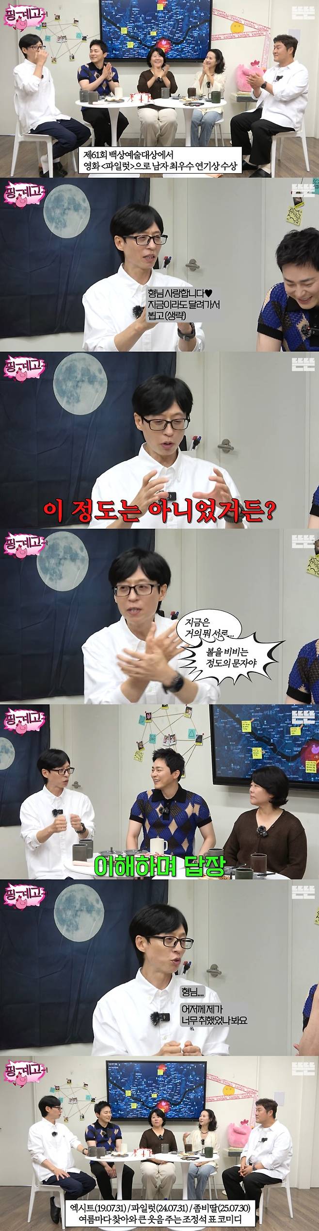 이날 유재석은 "조정석이 최근에 백상예술대상에서 상을 받았다"고 운을 뗐다. 조정석은 '파일럿'으로 남자 최우수 연기상을 받은 바 있다.