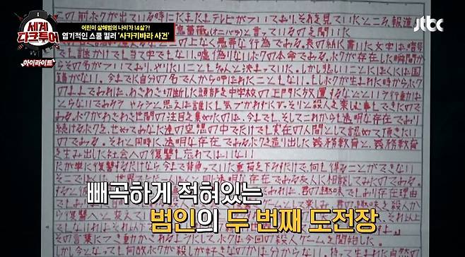 초기에 경찰은 스쿨킬러의 행적과 잔혹성 등을 고려하여 용의자를 30대 정도의 성인 남성으로 추정했으나 수사에 난항을 겪었다. 그런데 사건 발생 11일 만에 범인의 정체를 밝힐 만한 결정적인 증거가 발견된다. 고베의 한 신문사로 스쿨킬러가 보낸 두 번째 편지가 도착했다.