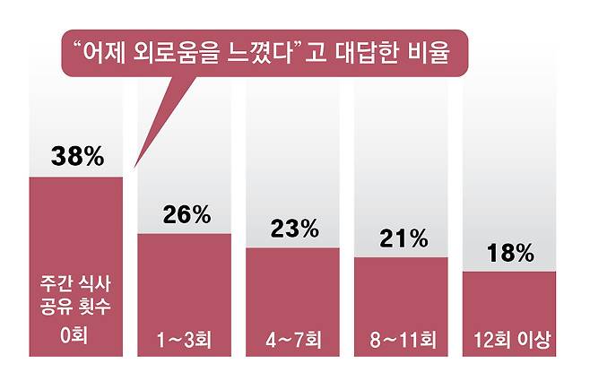 한국인의 식사 공유 횟수는 2022∼2023년 저녁 식사 기준으로 1주일 평균 1.6회였다. 조사대상 142개국 중 135위였고, G20 중에서는 일본(1.8회)과 함께 최하위권이었다. G20 중에서는 남아프리카공화국(5.0회), 호주(4.9회), 멕시코와 캐나다(4.8회), 아르헨티나(4.7회), 브라질과 이탈리아(4.6회) 등이 타인과 저녁 식사를 많이 즐기는 나라인 것으로 나타났다.