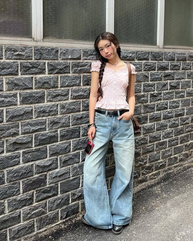 ✔ 연청 데님 와이드 팬츠 + 밝은 블루 셔츠