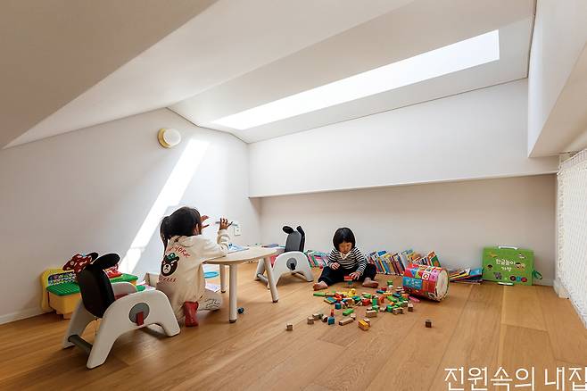 부부는 오랫동안 세심히 부지를 물색했고, 평소 교류하면서 가족의 취향과 필요한 여건을 잘 알고 있었던 건축사사무소 엠오씨와 프로젝트를 논의했다. 상가와 주택의 효과적인 분리, 입지상 불리할 수 있는 프라이버시 대책, 세 아이를 안심하고 케어할 수 있는 안전한 구조와 시야 확보 등 많은 고민들이 집에 담겼다.