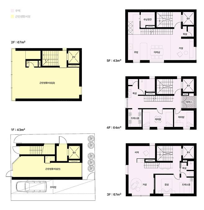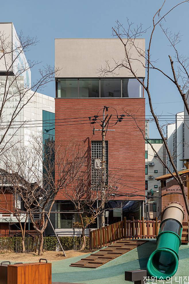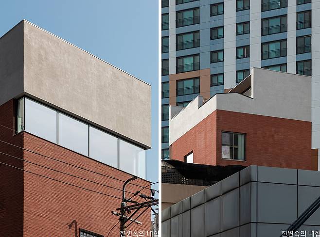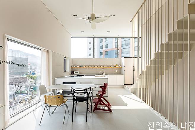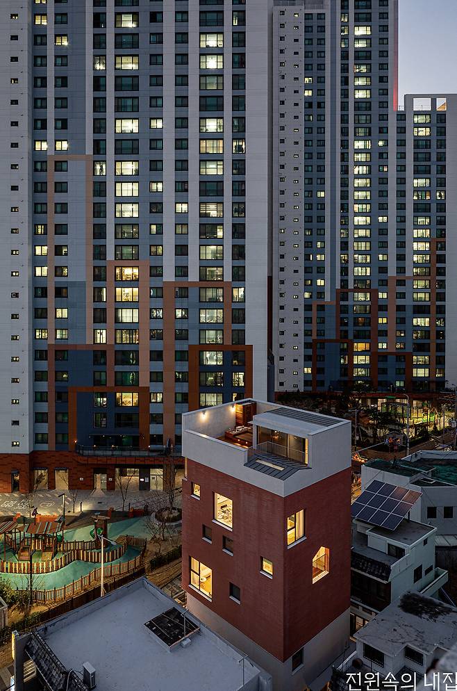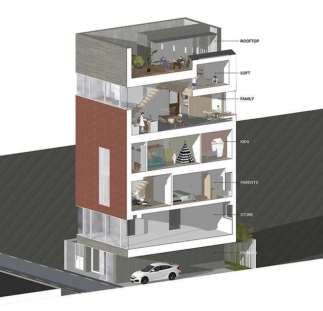 건축주 부부는 아이들의 통학 거리 등 여러 가지를 고려해 대단지 아파트가 계속 지어지는 학교 근처 준주거지역에 부지를 발견해 마련했다. 대지는 35평으로 작지만 일조 높이 제한이 없고 용적률 등에 여유가 있었다. 상가는 1~2층, 주택은 3~5층으로 계획되었다. 3층은 부부의 침실 등 사적인 공간, 뷰가 가장 좋은 5층에는 가족 모두가 어울리는 주방과 거실을 두었다. 4층에는 아이들 방을 두었는데, 부부가 동선 중에 자연스럽게 아이들을 케어하기 위한 의도가 반영됐다. 여기에 3,4층의 침실 층고를 조금 낮추고 그만큼 5층을 높여 침실에는 아늑함을, 거실에는 밝고 개방적인 분위기를 더했다.