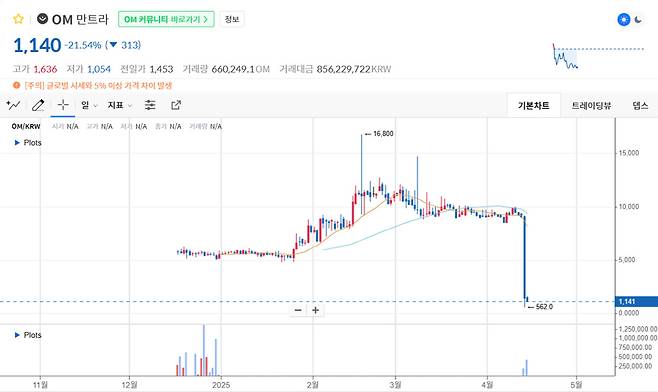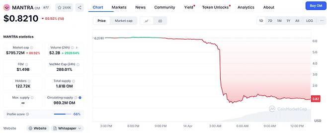 14일 가상자산 시황 플랫폼 코인마켓캡에 따르면 만트라 코인은 이날 오후 2시 기준 0.821달러, 코인원 기준 1144원에 거래되고 있다. 만트라는 전날 새벽 1시께 6.1325달러에 거래됐으나, 알 수 없는 이유로 하락하기 시작해 새벽 5시께 0.4325달러까지 급락하며 시가총액이 50억 달러(한화 7조 원) 이상 증발했다.