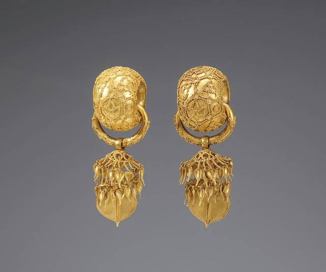 귀걸이는 외형상 귀에 직접 닿는 중심고리의 굵기에 따라 굵은고리(太鐶)와 가는고리(細鐶)로 구분됩니다. 경주 부부총에서 출토된 금귀걸이는 굵은고리이고 무령왕릉에서 출토된 귀걸이는 가는고리입니다. 굵은고리도 속이 텅 비어 있어서 그다지 무겁지는 않습니다. 경주 부부총 금귀걸이는 신라인의 금속공예기술의 수준을 가늠할 수 있는 대표적인 굵은고리귀걸입니다. 지름이 0.5㎜도 되지 않는 수백 개의 작은 금 알갱이를 누금(鏤金)세공으로 붙여놨습니다. 누금세공은 금줄(金線)과 금알갱이로 금판의 표면을 장식하는 기법으로 세금세공에서 최고의 단계입니다. 이미 5세기경에 신라 귀걸이 제작기술이 정점에 도달했음을 보여줍니다.