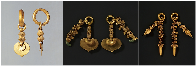 한국인의 귀걸이 사랑은 유난스럽습니다. 길거리를 걷다 보면 여자들뿐만 아니라 남자들도 귀걸이를 한 모습을 심심치 않게 볼 수 있습니다. ‘남자가 무슨 귀걸이?’라고 생각하는 사람도 있겠지만 알고 보면 유전자의 힘 때문입니다. 중국 당나라의 화가 염립본(閻立本)이 모사한 ‘왕회도(王會圖)’에는 6세기 초 양(梁)나라에 간 고구려, 백제, 신라의 사신이 등장합니다. 특이한 것은 세 명의 ‘남자’ 외교관이 모두 큼직한 귀걸이를 하고 있습니다. 1500여 년 전부터 한국 남자들이 귀걸이를 하고 있었다는 뜻입니다. 백제 무령왕(武寧王, 461-523)의 무덤에서는 왕과 왕비의 금귀걸이가 모두 5쌍이 출토됐는데 그중 하나는 왕의 것입니다. 삼국시대 무덤에서 출토 수가 가장 많은 부장품이 귀걸이입니다. 신라 무덤에서만 300여 쌍이 발견됐습니다. 고구려와 백제의 무덤에서는 도굴로 인해 귀걸이가 거의 발견되지 않았습니다.