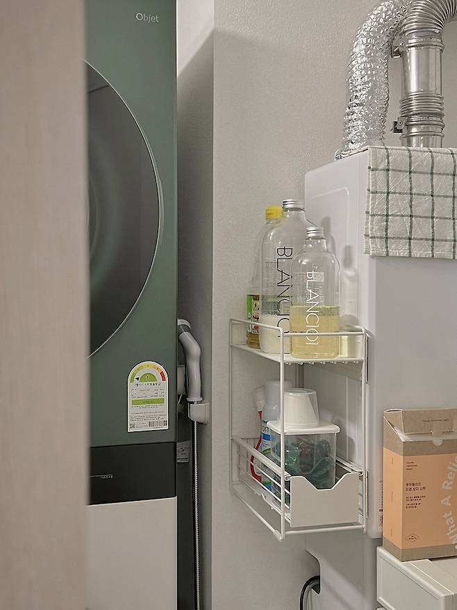 세탁실 안의 물건들을 밖으로 빼내지 않는 한 좁은 세탁실 안에서 수납을 최대한 해결하는 방법은 선반이나 수납장을 효율적으로 활용하는 게 최고랍니다!