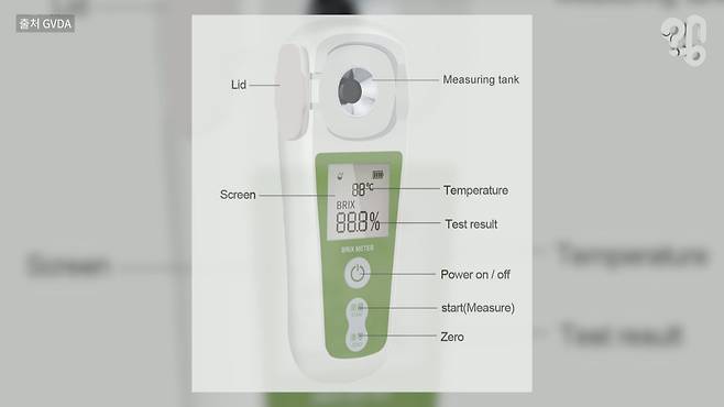 이때 굴절식 당도계라는 것을 사용하는데, 즙을 한 두 방울 흘려 넣으면 당도계가 과즙이 빛을 얼마나 굴절시키는지 측정해 당도로 환산한다.
