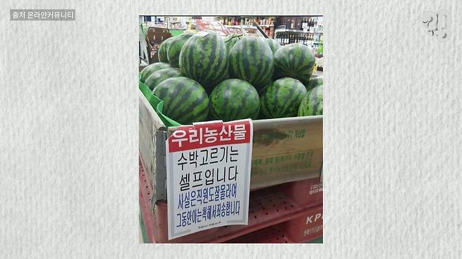 이 사진을 보라. 수박이 쌓여있는 마트 매대에 ‘수박 고르기는 셀프입니다’라는 문구가 적혀있다. 그 밑에는 사실 직원도 잘 모르고 그동안 아는 척해서 미안하다는 내용도 있다.