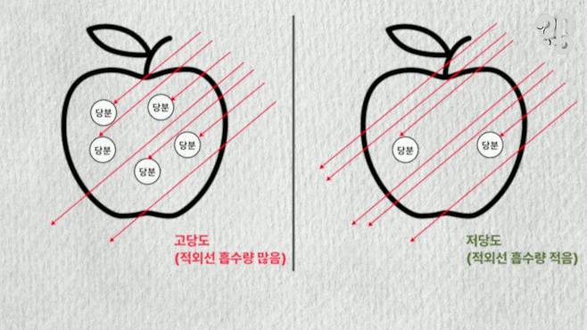 어려우니 쉽게 설명해보면, 일단 과일 속에 있는 당분은 근적외선을 흡수하는 성질이 있다. 그래서 근적외선을 비췄을 때 흡수되거나 반사되는 양이 많으면 당도가 높은 거다. 이걸 근적외선 분광법이라고 한다.