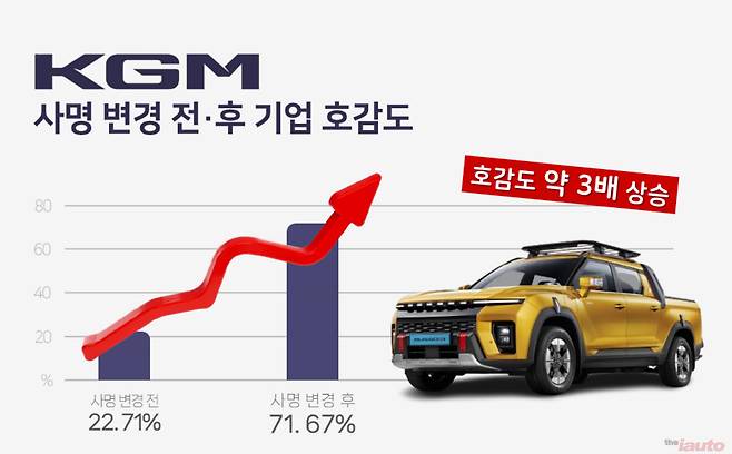 여론조사기관 데이터앤리서치에 따르면, 사명 변경 후 788일간의 온라인 정보량은 134만 건을 넘어 이전 쌍용자동차 시절 대비 101.3% 증가했다. 순호감도는 71.67%로, 사명 변경 전 대비 약 3배(48.96%P) 상승했다. 긍정률은 75.14%, 부정률은 3.47%에 불과한 것으로 집계됐다.
