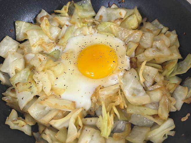 가운데를 동그랗게 비워두고 그 자리에 계란을 1~2개 깨서 올립니다. 후추를 계란 위에 조금 뿌립니다. 계란 2개와 양배추볶음을 먹으면 한 끼 식사로도 손색없을 것 같습니다.