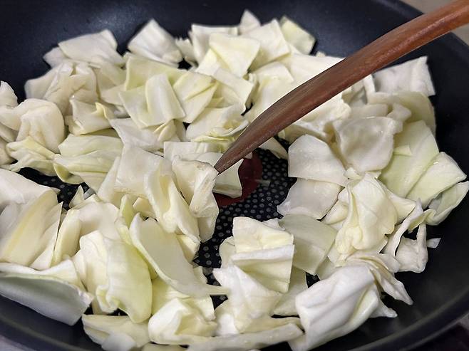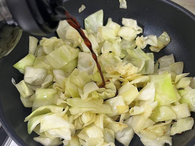 양배추는 약불에서 기름을 넣고 살짝 볶아 줍니다. 그다음 다진 마늘 1/2스푼을 넣고 마늘향을 입히며 함께 볶아 주세요.