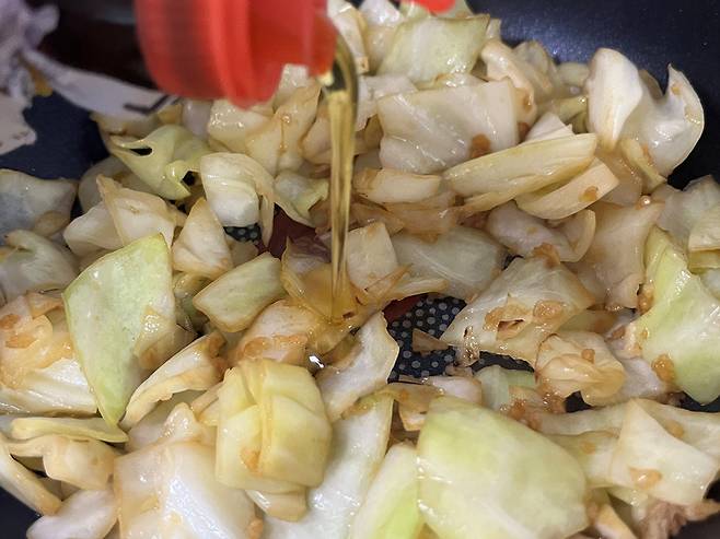 양배추가 반쯤 익으면 참기름 1스푼을 둘러서 함께 볶아 주세요.