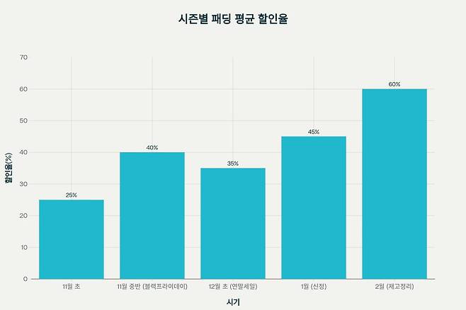 1월(신정)에는 45% 평균 할인으로 상승한다. 이 시기 쿠팡, SSG닷컴 등이 시즌 오프 세일을 본격화한다.