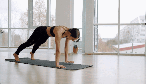 매트에 엎드려 플랭크 기본자세로 시작합니다. 손으로 바닥을 밀며 상체를 세우고, 서는 자세로 전환합니다. 다시 상체를 앞으로 숙여 손을 바닥에 짚은 후, 손을 앞쪽으로 이동시켜 플랭크 자세로 돌아옵니다.