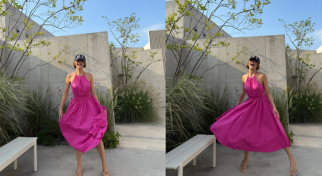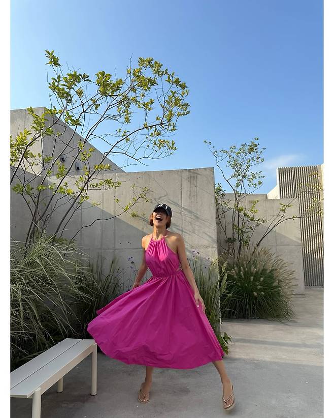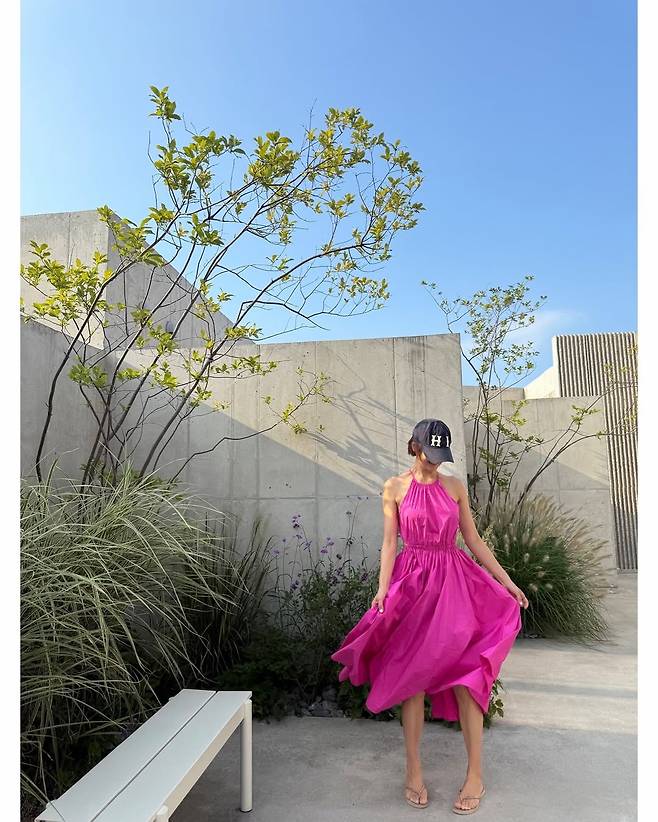 사진 속 그는 쨍한 핫핑크 컬러의 홀터넥 롱 원피스를 입고 특유의 건강미를 뽐냈다. 53세라는 나이가 믿기지 않는 완벽한 자태다.