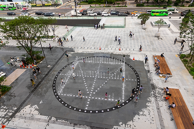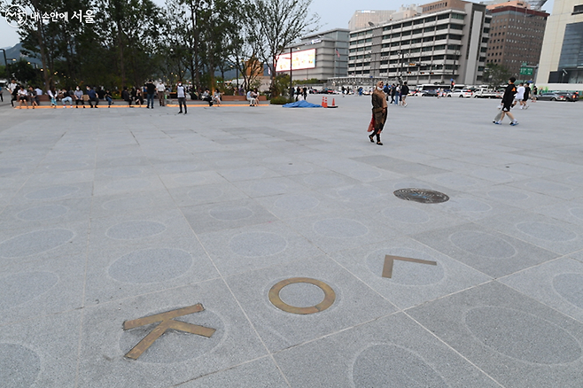 여섯째, 이순신장군상 옆 바닥의 ‘한글분수’ 에서는 인기 드라마 <오징어게임>에 나오는 로고(○△□)를 찾을 수 있다. 그러나 사실 이 모양은 <오징어게임> 이전에 디자인된 것으로, 한글 창제 원리인 천(○), 지(□), 인(△)을 상징하는 모양을 합쳐 만들어졌다. 주변 건물에 올라가면 더 정확한 모양을 찍을 수 있다.