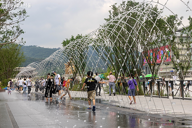 ‘터널분수’는 해방 이후부터 2022년까지, 근현대사 77년을 상징하는 77개 물줄기가 아치 모양의 통로를 만든다. 시원한 물줄기 터널 속을 걸을 수 있어 무더운 여름 광화문광장을 찾은 시민들에게 가장 인기있는 장소 중 하나다.