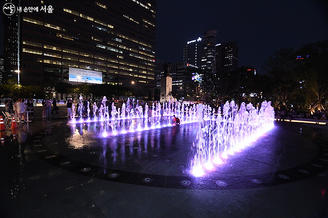 둘째, 77개의 물줄기가 만들어내는 ‘터널분수’(세종문화회관 앞)에서 광화문과 숲을 배경으로 찍는 사진이다. 특히 늦은 저녁에 가면 왼쪽 바닥에 은하수 조명이 연출되고, 오른쪽 해치마당 벽면에는 53m 길이의 고해상도 미디어아트가 펼쳐져 화려한 야경을 담을 수 있다.