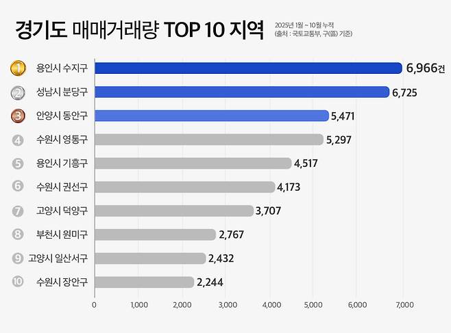 18일 한국부동산원에 따르면 올해 1~10월 수지구 아파트 거래량은 총 6966건으로 경기도 내 구(區) 기준 1위를 기록했다. 수지구 다음으로는 성남시 분당구(6725건)와 안양시 동안구(5471건) 순이었다.