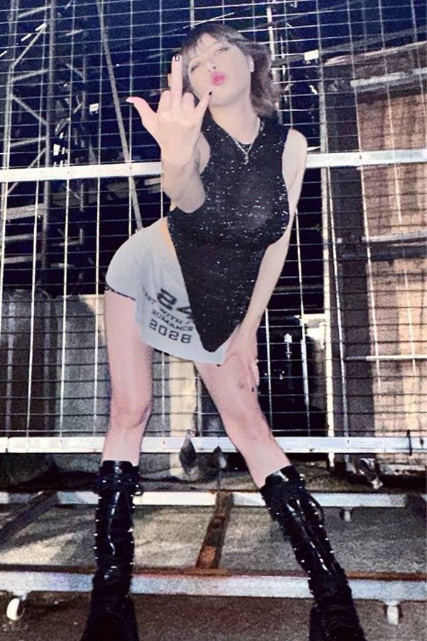 검은색 시스루 상의와 미니스커트를 매치한 모습은 그녀의 파격적인 스타일을 그대로 드러냈으며, 레드 립 메이크업으로 포인트를 준 모습이 돋보인다.