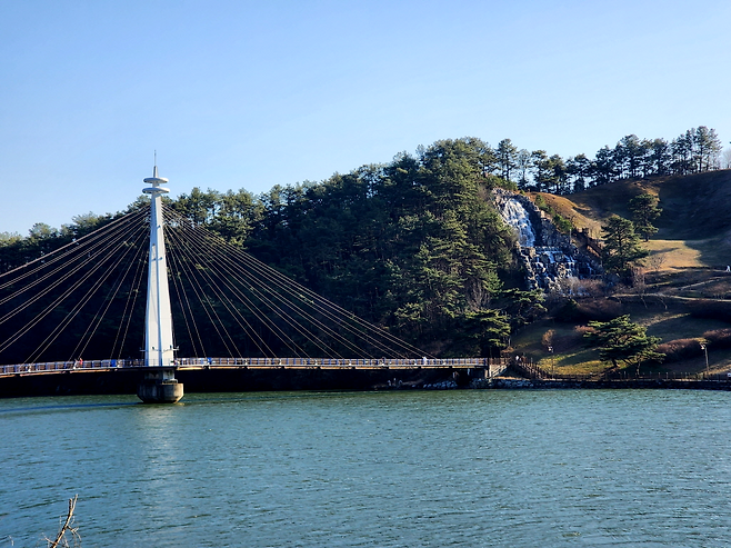 공원 안쪽 인공폭포 방향으로 이어지는 길을 따라 올라가면 작은 전망대를 만날 수 있습니다. 이곳은 지리산 호수공원의 풍경을 한눈에 바라볼 수 있는 조망 지점입니다. 초봄에는 나무들이 아직 잎을 완전히 피우기 전이라 시야가 비교적 넓게 열립니다. 그래서 구례읍 시가지와 함께 멀리 지리산 노고단 능선, 그리고 사성암 방향의 산세까지 비교적 선명하게 바라볼 수 있습니다.