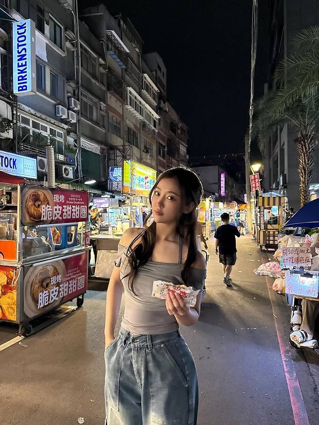 타이페이 라오허제 야시장에서 포착된 송지우의 데일리룩이 눈길을 끈다. “망고 빙수가 최애”라는 귀여운 멘트와 함께 공개된 이 사진은 오프숄더 톱과 빈티지 데님의 조화로 쿨한 무드를 자아낸다. 네온 간판과 전통적인 야시장 입구가 어우러진 배경은 그녀의 자유로운 스타일을 더욱 돋보이게 한다.