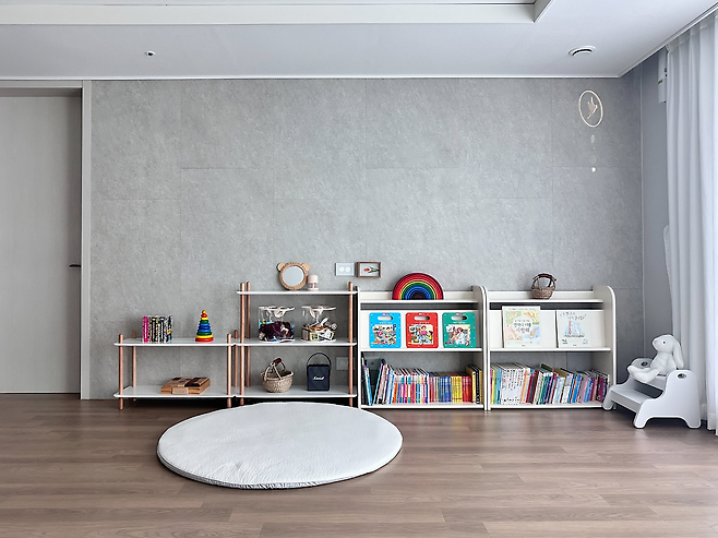 거실에는 아이의 개성을 반영한 알록달록한 아이 물건을 조화롭게 배치했어요. 손이 닿는 높이의 선반과 책장에 물건을 정리해 주었더니 아이도 이곳을 굉장히 좋아한답니다. 아이 물건이 아닌 나머지 가구는 되도록 무채색의 톤으로 통일감을 주어 공간에 단정한 느낌이 나도록 했어요. 최근엔 아기 매트를 치우고 러그를 깔았는데 더 포근하고 아늑한 느낌이 들어 만족스럽습니다.