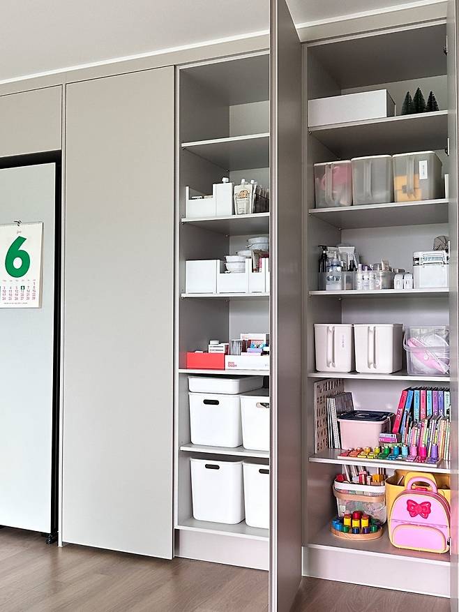 여긴 냉장고 오른쪽에 붙어있는 수납장이에요. 숨기고 싶은 물건 대부분이 들어있습니다. 정리할 땐 최적의 수납을 위해 다양한 정리 용품을 활용했어요. 덕분에 바깥에서 안의 물건이 잘 보이지 않아 깔끔해 보인답니다. 팬트리의 하단부에는 아이 물건을 넣어 두고 언제든 스스로 꺼내 놀 수 있게 했어요.