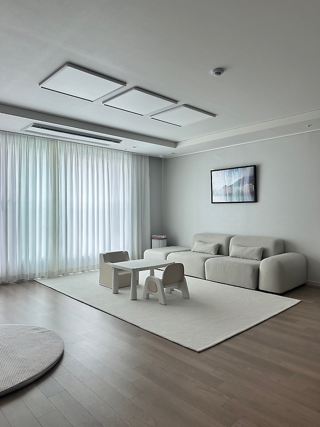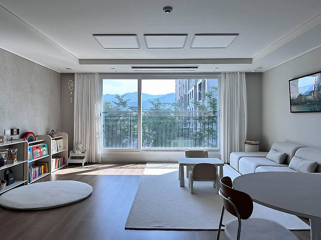 저희 집 거실의 특별한 점은 과감하게 'TV'를 없앴다는 거예요. 불편할까 봐 걱정했는데 이전보다 마음도 편하고, 하루 종일 고요함을 즐길 수 있어 한동안은 계속 두지 않을 예정이에요. 덕분에 요즘 거실은 저희 가족이 함께 모여 이야기도 하고, 책을 보거나 놀이도 하는 아주 소중한 공간이 되었어요. 아이도 TV를 찾지 않아 아주 좋은 변화였다고 생각합니다.