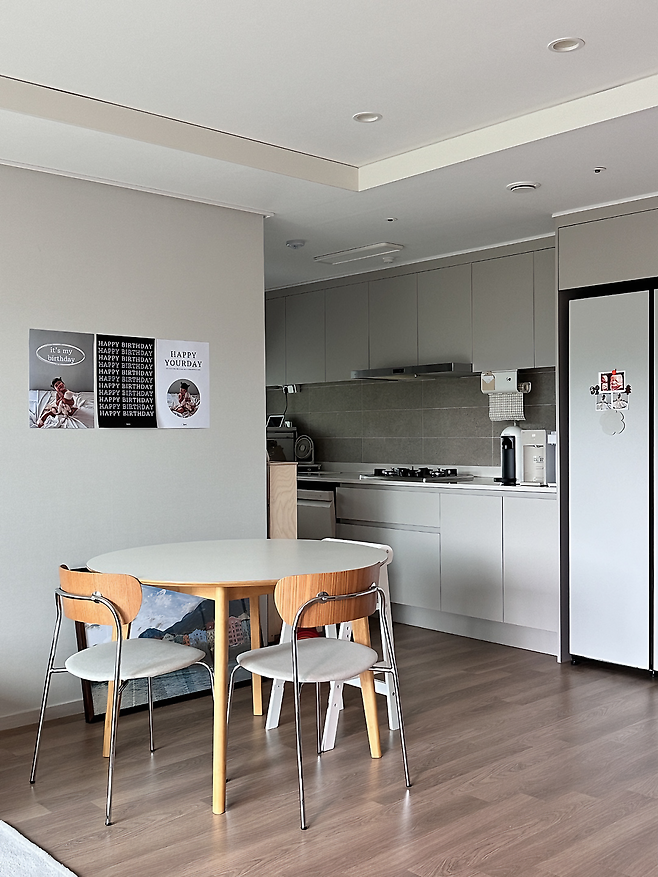 거실에 붙어있는 다이닝 공간에는 작은 원형 식탁을 두고 작지만 알뜰하게 사용하고 있어요. 예전에는 식탁 옆에 수납장을 두고 지냈는데, 공간이 복잡해 보이는 것 같아 지금은 식탁만 두고 쓰고 있어요.