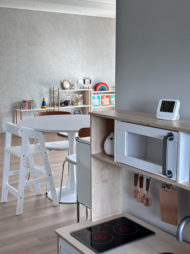 저희 집 주방엔 아이 주방놀이가 있어요. 제가 주방에 있을 때면 아이도 아이 주방에서 과일을 씻기도 하고, 설거지도 하면서 함께 시간을 보낸답니다. 가끔씩 간식 준비도 스스로 하게 해주었더니 굉장히 즐거워하더라고요. 아이가 주방놀이를 잘 가지고 놀지 않는다면 주방으로 위치를 옮겨보시는 것도 좋은 방법 같아요.